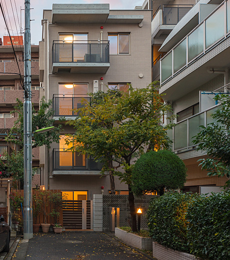 配置計画は、精養堂アパー トメンツと平行した南北軸配置。店舗と住宅の入口を明確に分ける為に、西側境界に沿って深い奥行きのコリドーを設け、奥まったエントランスを中心とした住戸配置となる。南西側の広がった敷地部分には南面する別棟を配置し、結果として多様な住戸プランが生まれた。