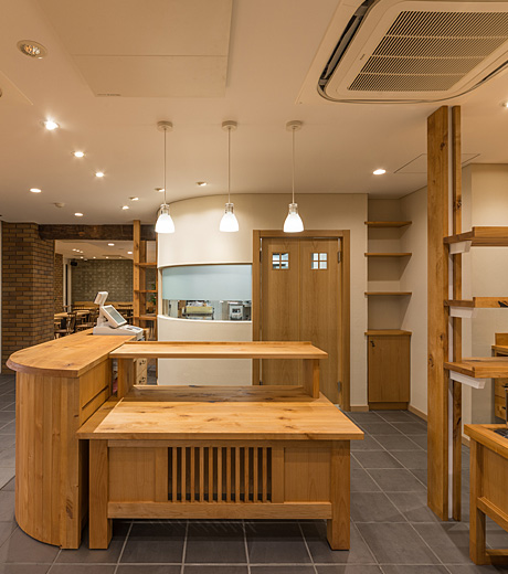 売り場の床には燻した煉瓦を、カフェの床にはテラスに連続するウッドデッキ材を使用した。壁仕上げは外部のせっき質タイルを取り込みやわらかな左官材壁と対比させている。カフェ奥の壁には50年以上パンを入れる木箱として使用されてきた板を型枠材として使い、木箱に書かれていた精養堂の文字が絶妙に浮き上がり伝統を感じさせている。